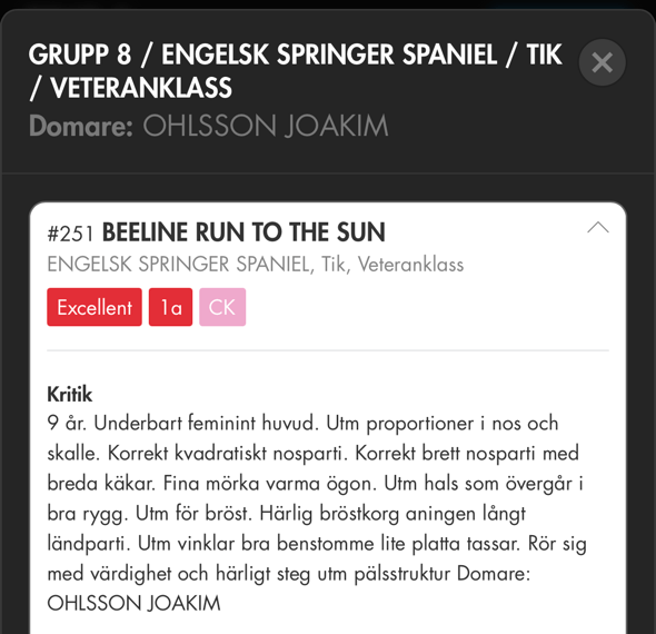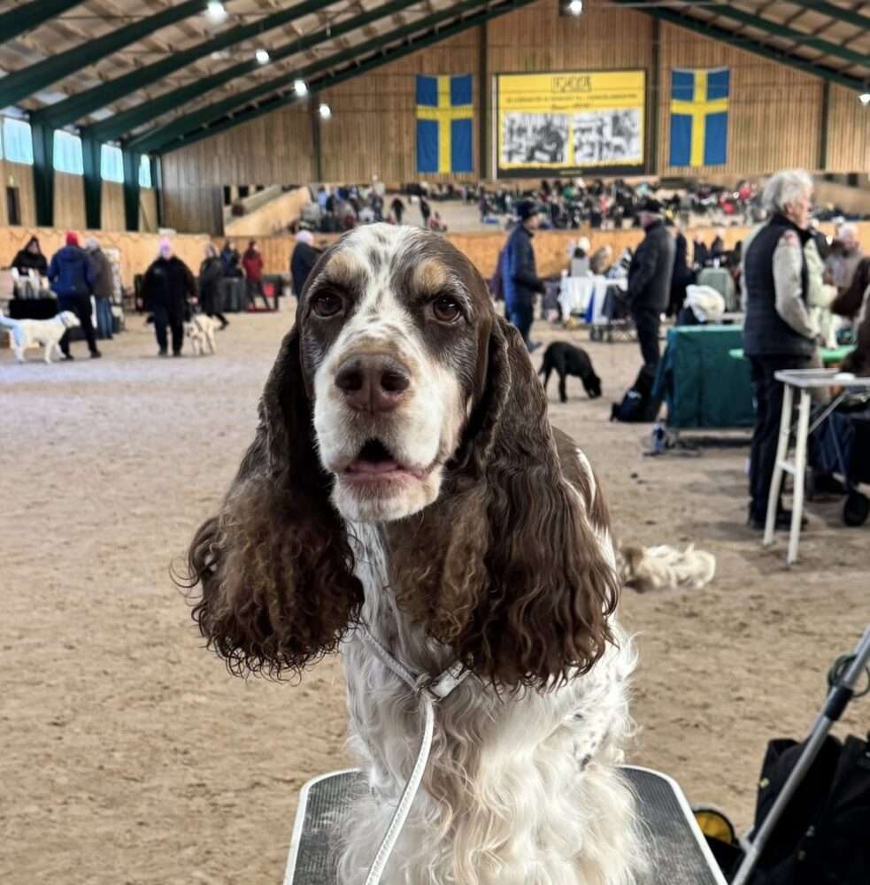 Ganska exakt 7 månader efter utställningen i Bjuv där hon allså tog sitt första cert vid 4 års ålder och debuten i öppen klass var det dags för SKK Int Göteborg som också heter My Dog och är är Nordens största utställning. Jag hade inte så stora förhoppningar utan att det skulle bli en trevlig resa. Domare på lördagen var Mr Geir Flycht Pedersen, numera i USA men har ett norkst/svenskt förlutet med cocker. Hans första kommentar när han började gå över Nikkee var ”such a sweet girl” och det håller jag såklart med om. Sedan var det som i en dröm när hon vann öppna klassen och sedan var på håret att även bli bästa tik men slutade som tvåa. Aldrig tidigare har nog setts en gladare tvåa än jag och Nikkei! Inte nog med att hon slog en rad av mycket fina tikar inklusive championtikar så fick hon i och med detta sitt tredje certifikat och blev Svensk Utställningschampion! Hon fick även r-cacib. Domarens kommentar var att han kunde inte fatta att hon inte blivit champion tidigare men han visste ju inte att hon haft 3 kullar och tänkte inte på att det gått bort 2 år med covid utan utställningar. Vilken stjärna min Nikkei är! Alltid så glad och älskar att visa upp sig som du kan se i filmerna. Jag känner mig extra stolt över att ha visat fram även hennes mamma Beeline Iced Chiffon och mormor Trollängens Enough Is Enough till championat. Det är en tiklinje att vara rädd om.